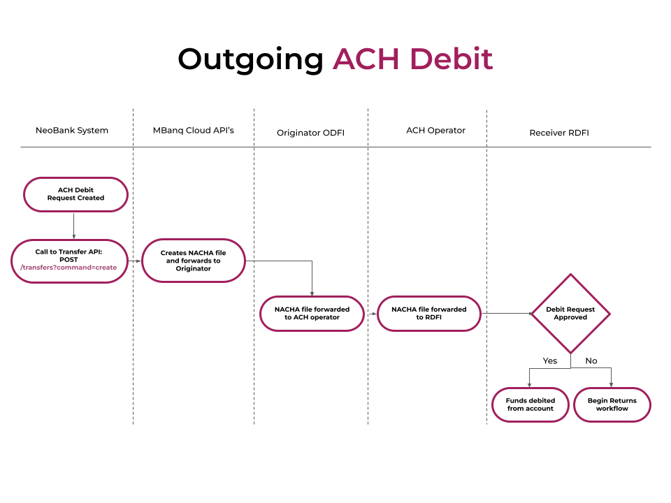 - MBanq Cloud, acting as the Originating Depository Financial Institution (ODFI), debits the requested amount from the customer's account within their system.